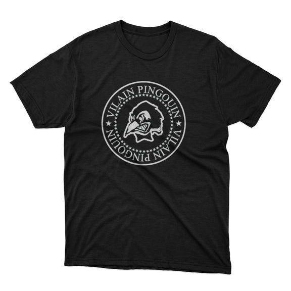 Black unisex or women's cut t-shirt with "Vilain Pingouin" design on the front.