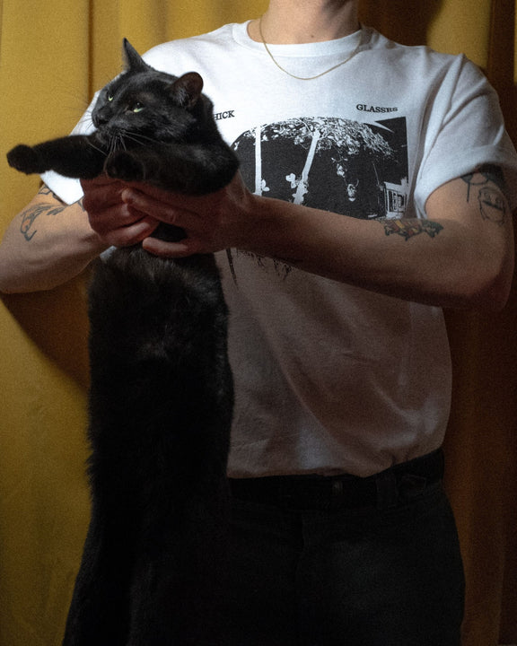 T-shirt blanc unisexe de Thick Glasses avec le design du nouvel album "Dans l'abysse" à l'avant.
