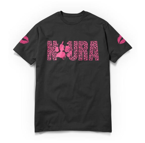 T-shirt noir unisexe du groupe Noura avec le design "Noura" à l'avant et sur les manches. Impression en rose.
