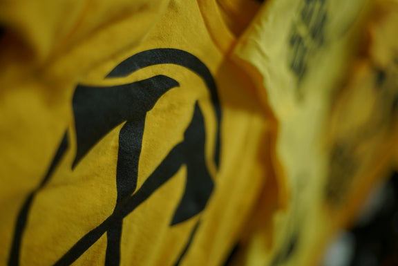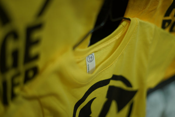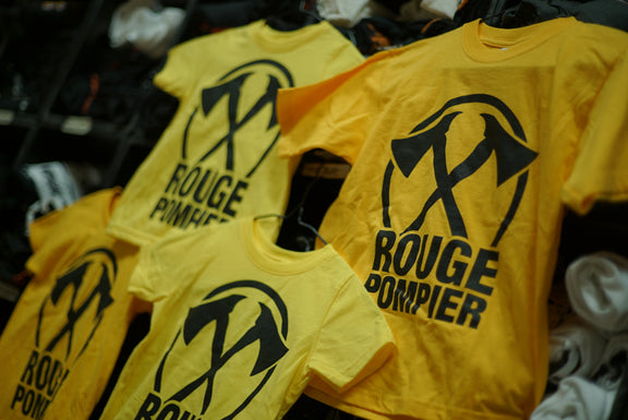 T-shirt jaune coupe enfant avec logo "haches" noir de Rouge Pompier centré en avant.