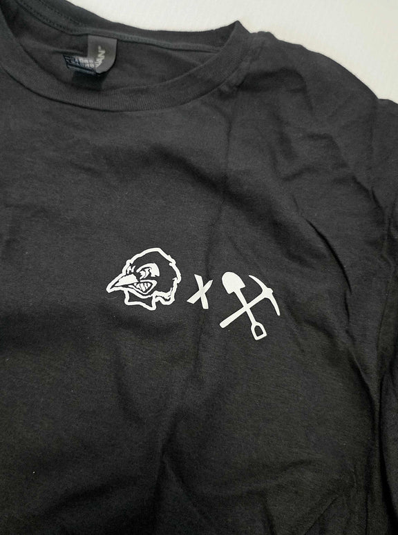 T-shirt noir unisexe avec petit logo à l'avant et le design "Prospecteur" à l'arrière.